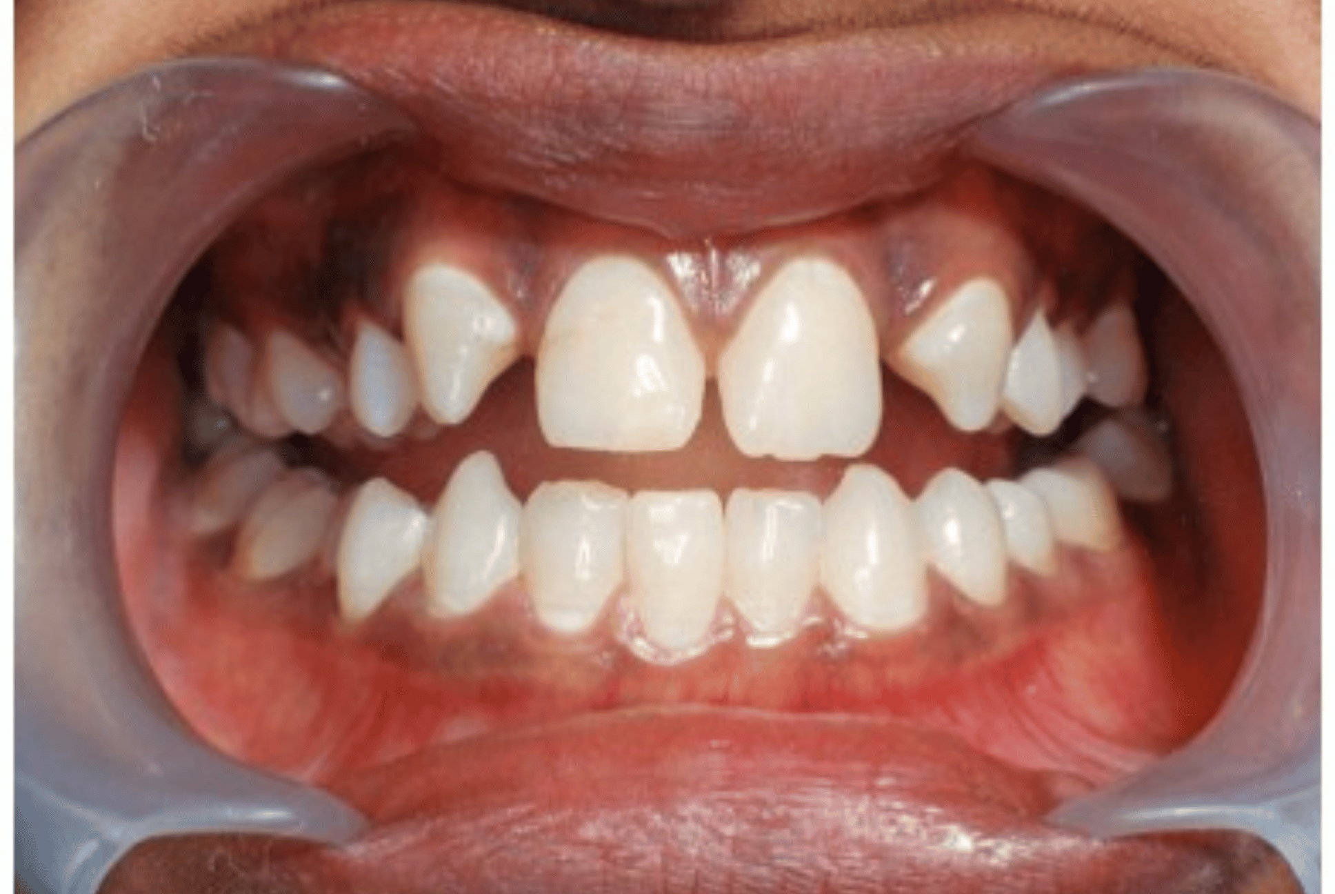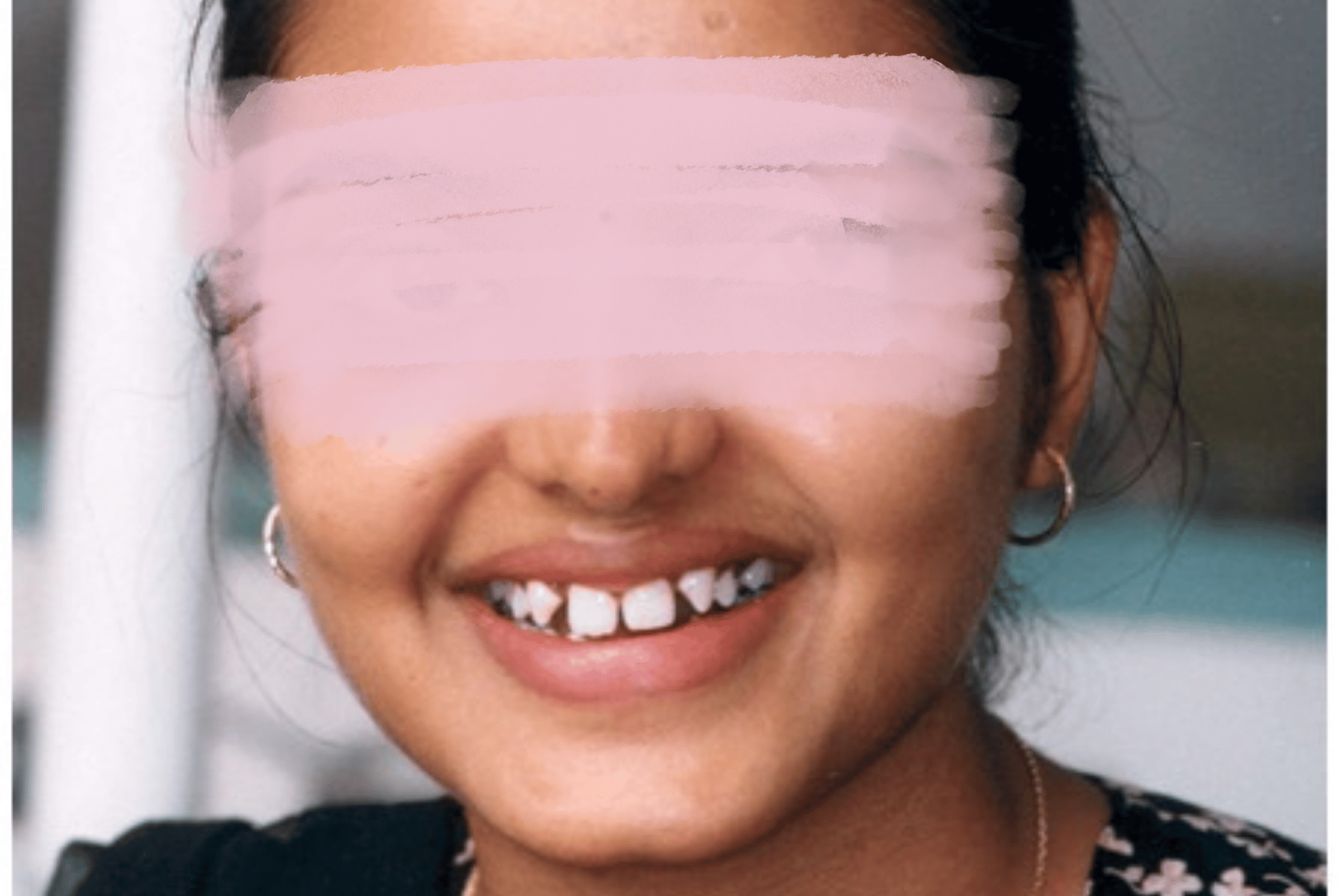 A patient’s smile makeover at Dr. Cherian’s dental clinic, showcasing the dramatic results of a single metal-free crown and veneers to correct teeth and close a gap