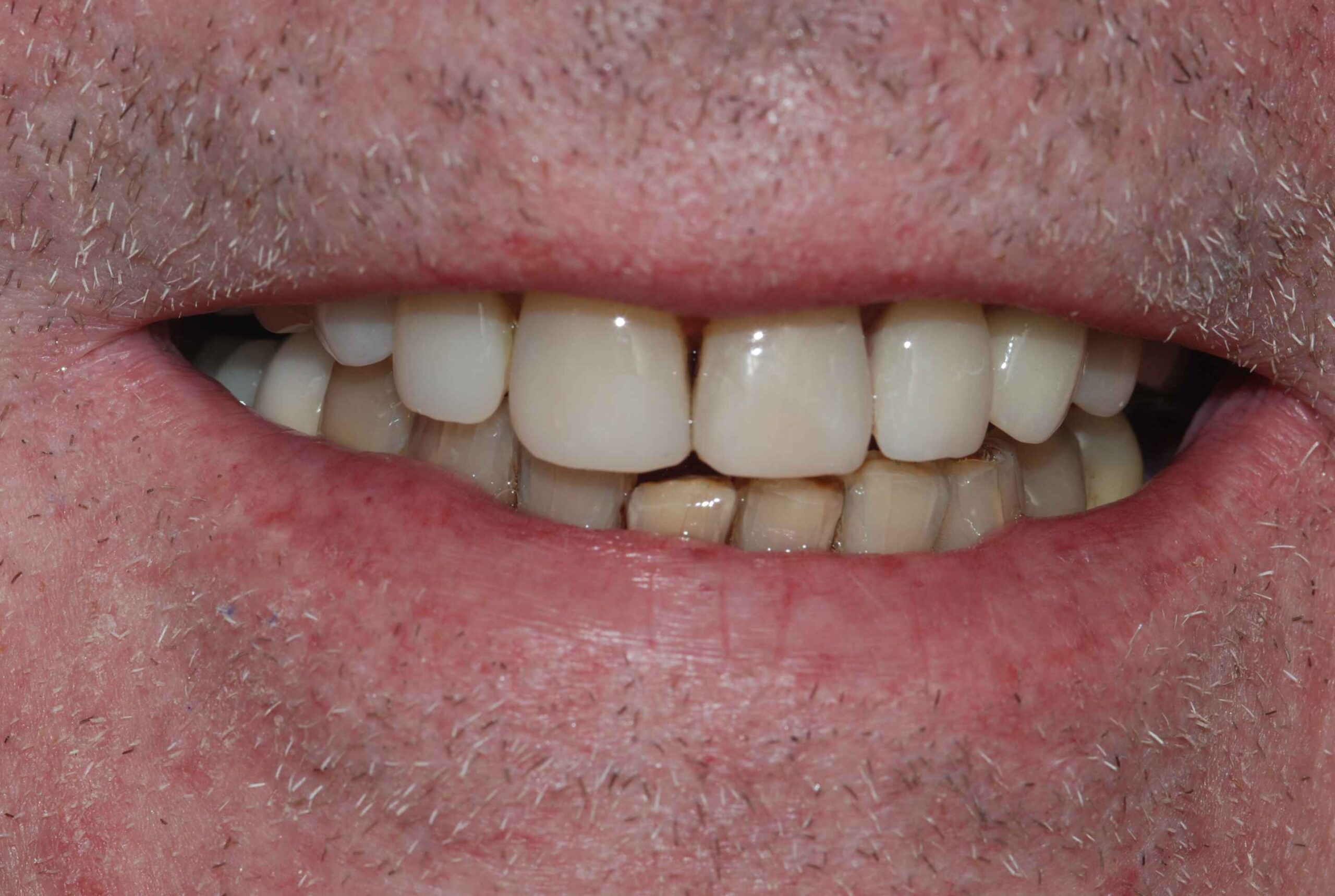 The smile was corrected using a combination of a metal-free crown and composite veneers, transforming it from a negative to a positive and more appealing smile.