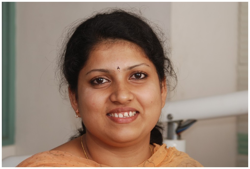 Before and after photo of a smile correction case at Dr. Cherian’s dental clinic in Kochi, Kerala. The treatment involved a metal-free crown and veneers to close a front tooth gap.